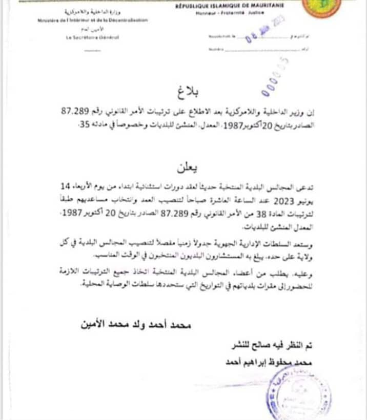 تدعى المجالس البلدية المنتخبة حديثاً لعقد دورات استثنائية ابتداء من يوم الأربعاء 14 يونيو 2023 عند الساعة العاشرة صباحاً لتنصيب العمد وانتخاب مساعديهم طبقاً لترتيبات المادة 38 من الأمر القانوني رقم 87.289 الصادر بتاريخ 20 أكتوبر 1987، المعدل المنشئ للبلديات.