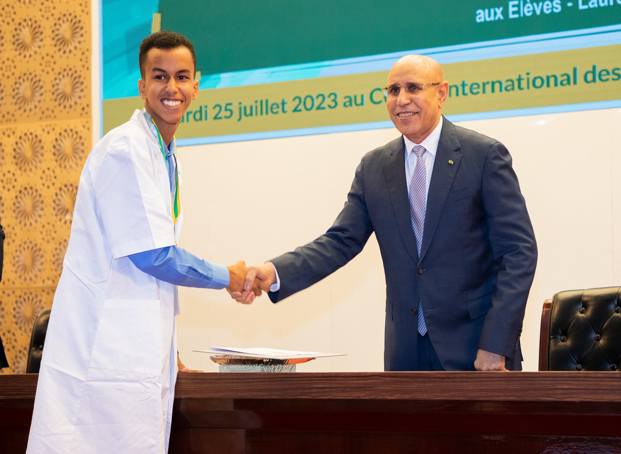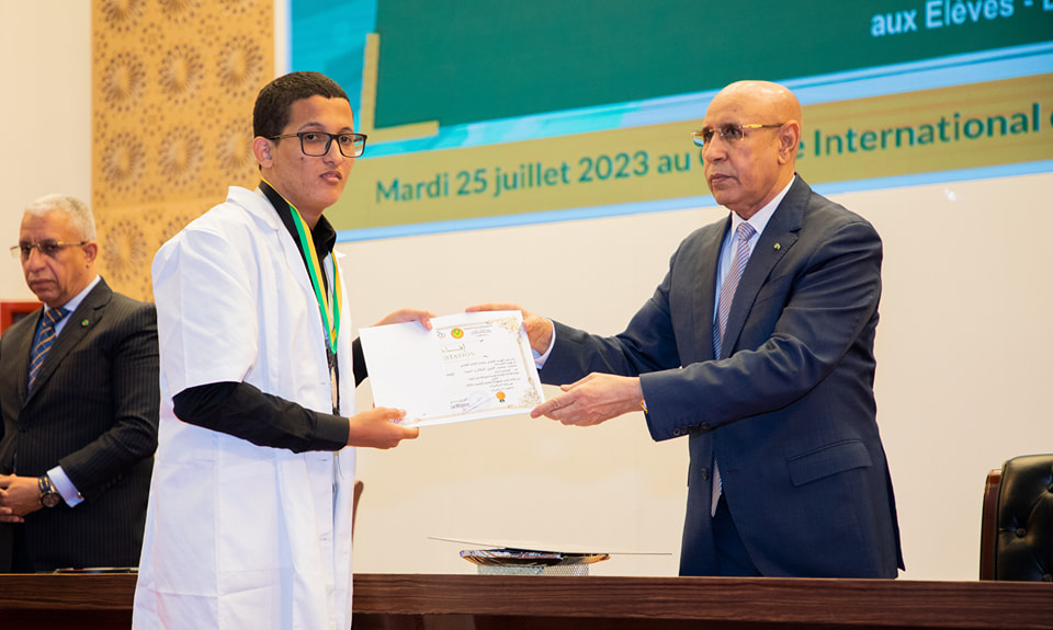 أشرف رئيس الجمهورية محمد ولد الشيخ الغزواني مساء اليوم الثلاثاء بالمركز الدولي للمؤتمرات في نواكشوط على حفل تسليم جائزة رئيس الجمهورية للعلوم، للتلاميذ المتفوقين في المسابقة الوطنية الأولمبياد ورالي العلوم لسنة 2023