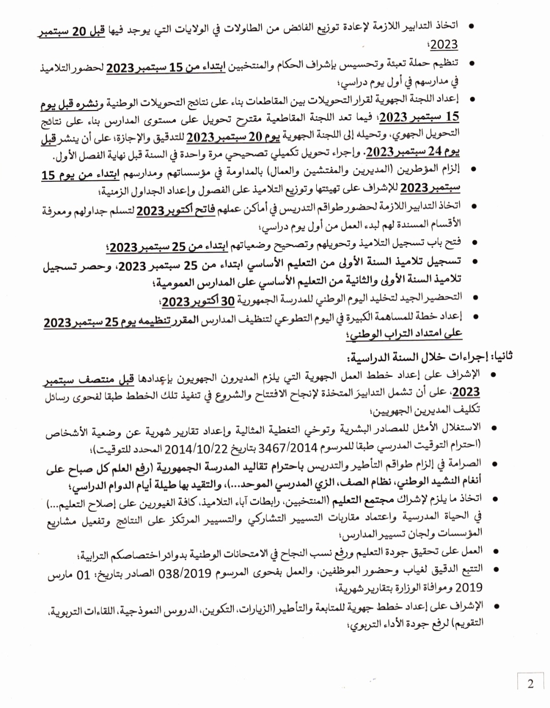 ويتضمن هذا التعميم اتخاذ اجراءات قبل نهاية شهر سبتمبر المقبل،و أخرى خلال السنة الدراسية.