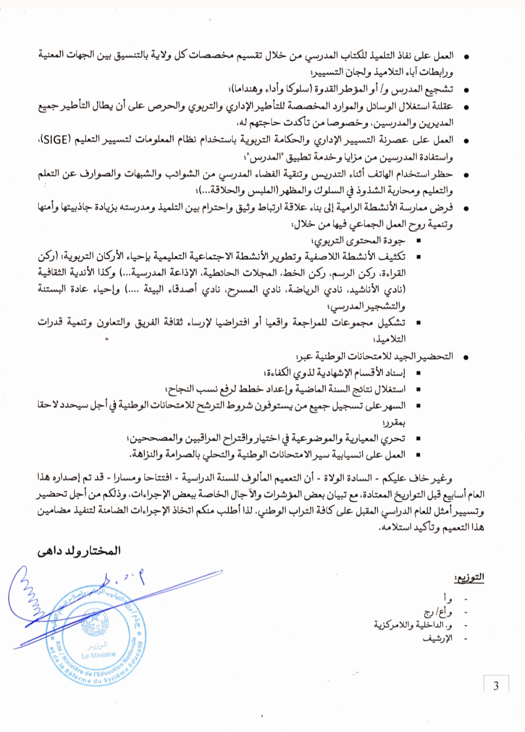 أصدر وزير التهذيب الوطني وإصلاح النظام التعليمي المخطار ولد داهي تعميما جديدا الى جميع الولاة والمديرين الجهويين للتهذيب بخصوص افتتاح السنة الدراسية 2023- 2024، وذلك من اجل اتخاذ الإجراءات المطلوبة لضمان افتتاح دراسي ناجح وفي الآجال المحددة لذلك.