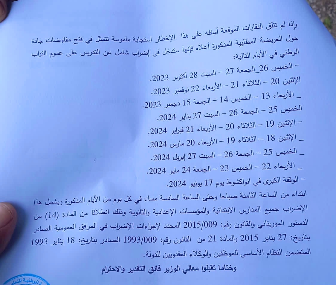 تقدم اتحاد نقابات التعليم الموريتانية بعريضة مطلبية مذيلة بإخطار بسلسلة إضرابات إلى وزير التهذيب الوطني و اصلاح النظام التعليمي.