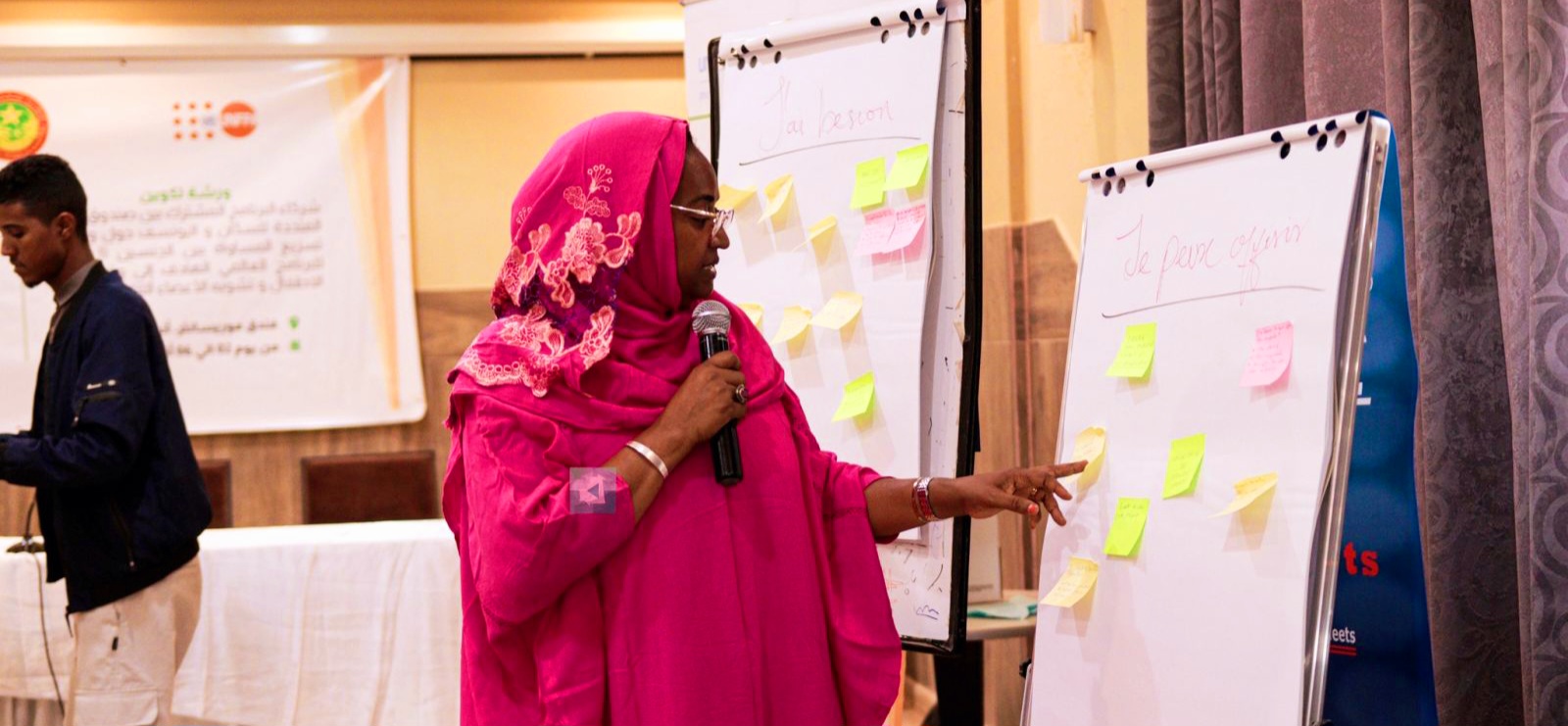 وتشارك السيدة زينب منت سيديني رئيسة المنتدى المجتمع المدني في لعصابه في هذه الورشة ممثلة للمجتمع المدني في لعصابه. ٥٤