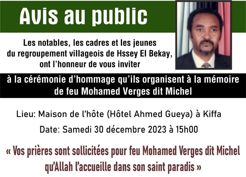 يتشرف وجهاء واطر وشباب تجمع قرى احسي البكاي بدعوتكم لحضور حفل تأبين المغفور له بإذن الله محمد فرجس الملقب ميشل، وذلك يوم السبت 30 ديسمبر 2023 بدار الضيف (فندق ولد كي ) عند الساعة الثالثة ظهرا.