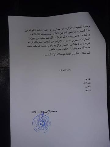 تنفيذا لأوامر وزير العدل محمد محمود ولد بيه بناء على فتوى من الامام أحمدو ولد لمرابط أشار فيها إلى إمكانية الافراج عن مدانة بالرجم إلى حين تنفيذ العقوبة، فقد أصدر المدعي العام لدى المحكمة العليا تعميما إلى النيابة العامة يحثهم على الافراج مدان نهائيا بعقوبة الرجم شريطة تقديمة ضامن إحضار يوثق به.