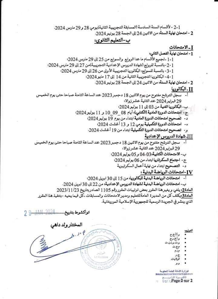 أصدر وزير التهذيب الوطني وإصلاح النظام التعليمي المختار ولد داهي مقررا جديدا يحدد تواريخ امتحانات السنة الدراسية الجارية.