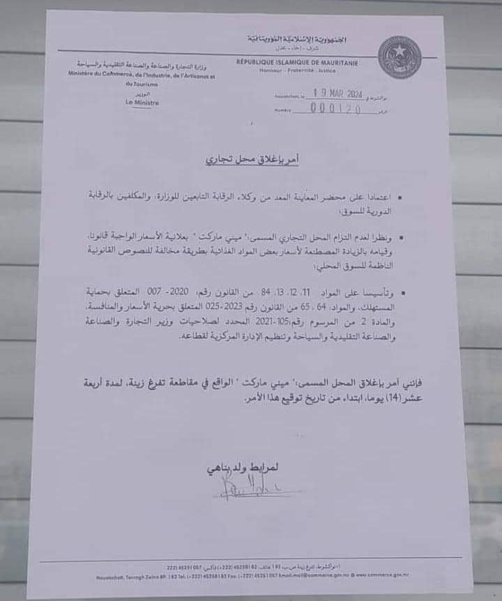 وحسب أمر إغلاق صادر عن وزارة التجارة، "، فقد أغلق أحد المحلات 14 يوما بسبب عدم احترام علانية الأسعار.