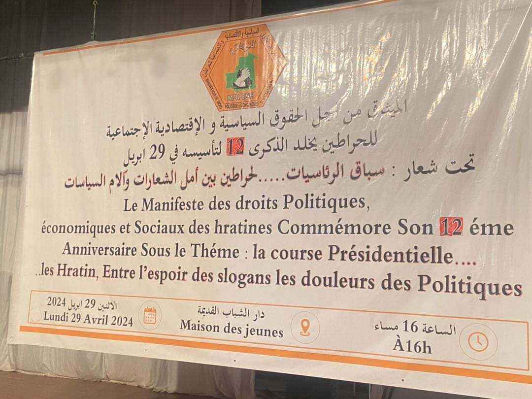 خلد الميثاق من أجل الحقوق السياسية والاقتصادية والاجتماعية للحراطين مساء اليوم الإثنين الذكرى 12 لتأسيسه تحت شعار " سباق الرئاسيات.... لحراطين بين أمل الشعارات وآلام السياسات" بدار الشباب القديمة وسط حضور معتبر من قيادات الميثاق وبعض المنتخبين والحقوقيين.