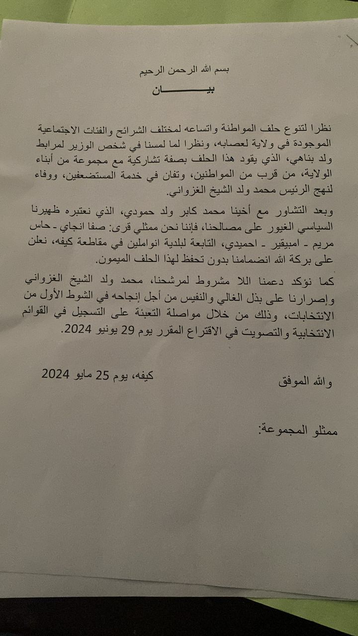 وقالت المجموعة في بيان تلاه أحد أعضائها بحضور الوزير إنه نظرا لما لمسته في شخصية الوزير من قرب من المواطنين و التفاني في خدمة المستضعفين، والوفاء لنهج الرئيس محمد ولد الشيخ الغزواني، وبعد مشاورات مع ظهيرهم السياسي محمد كابر ولد حمود فإنهم كممثلين لقرى (صفنجاي – حاس مريم – مبيقير – حميديت) التابعة لبلدية نواملين يعلنون على بركة الله انضمامهم بدون تحفظ لهذا الحلف الميمون بقيادة الوزير لمرابط ولد بناهي،كما يؤكدون دعمهم اللامشروط للمرشح محمد ولد الشيخ الغزواني وبذلهم الغالي و النفيس من أجل انجاحه في الشوط الأول من الاقتراع يوم 29 يونيو القادم.