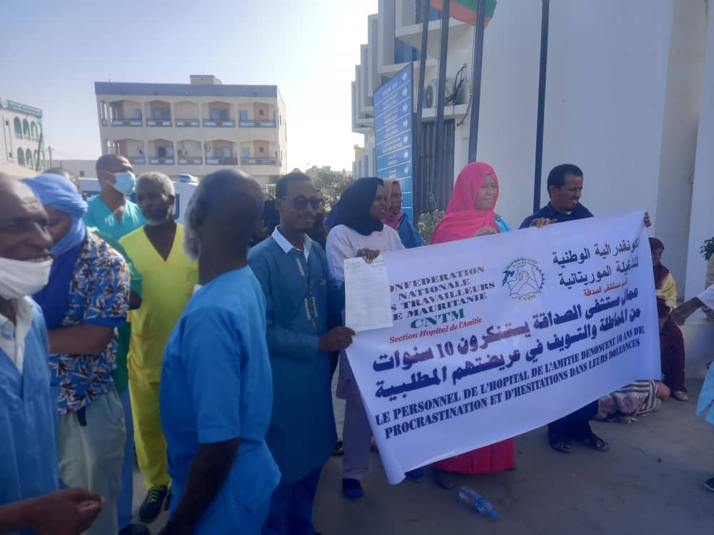 نظم عمال مستشفى الصداقة اليوم ابتداء من الساعة التاسعة صباحا الموافق 04 نوفنبر 2024 وققة احتجاجية ردا على تسويف الإدارة، ومماطلتها في تلبية عريضتهم المطلبية منذ عشر سنوات. وذلك بدعوة من مندوبي الكونفدرالية الوطنية للشغيلة الموريتانية CNTM.