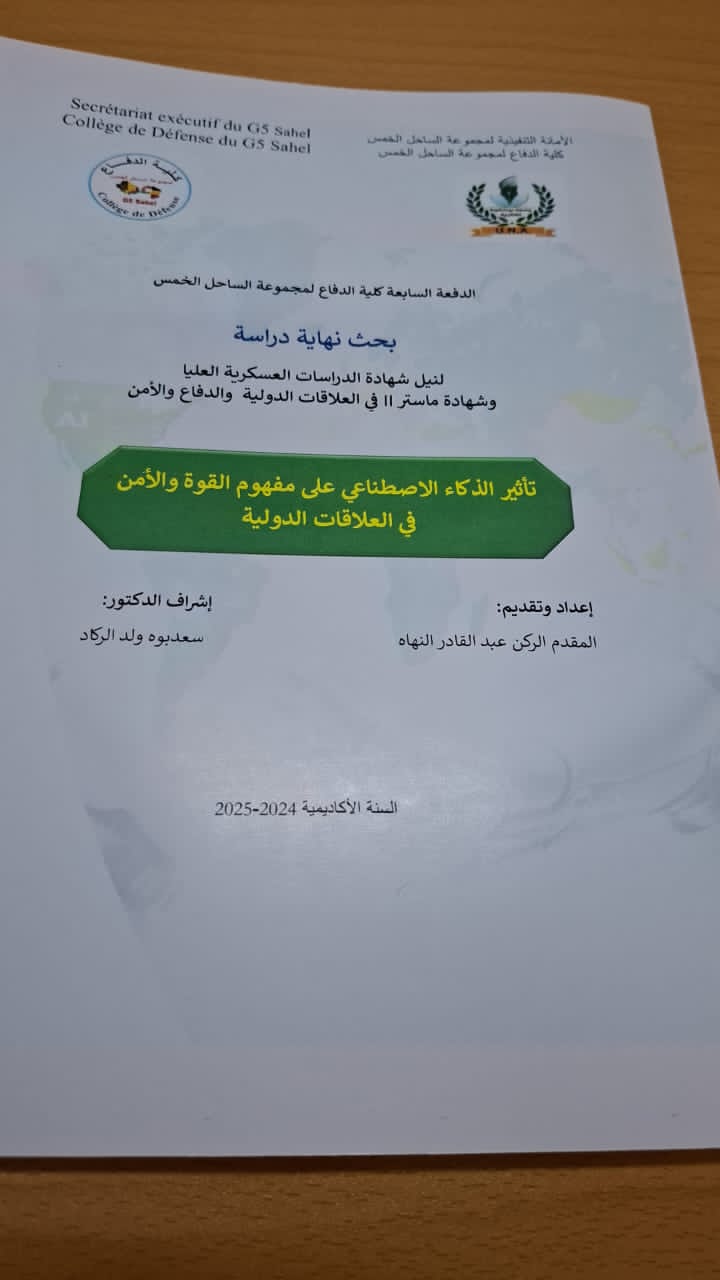 البحث تحت عنوان تأثير الذكاء الاصطناعي على مفهومي القوة و الأمن في العلاقات الدولية مع دراسة حالة موريتانيا في مجال الرقمنة ، ليحصل على نتيجة 17/20 و يتخرج بتقدير ممتاز للسنة الأكاديمية: 2025/2024.