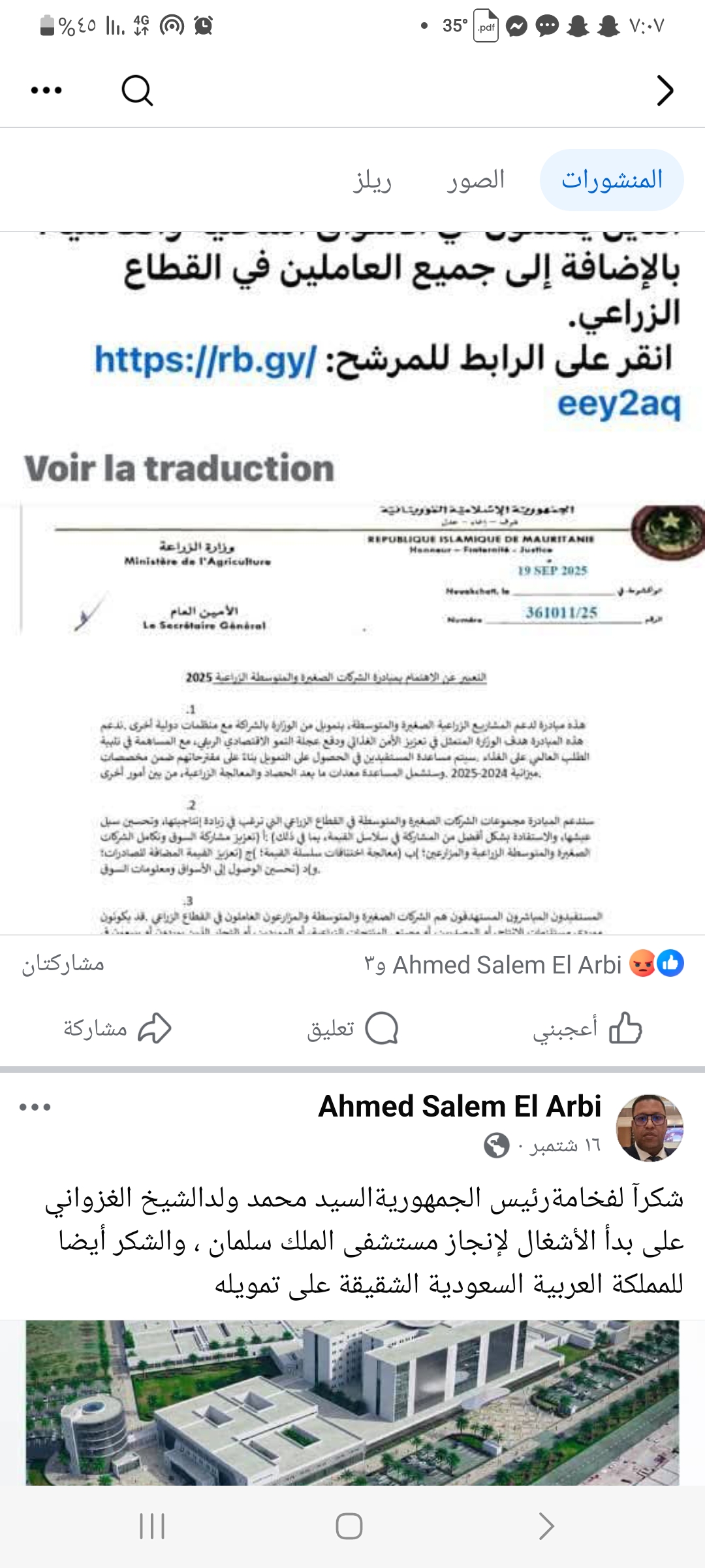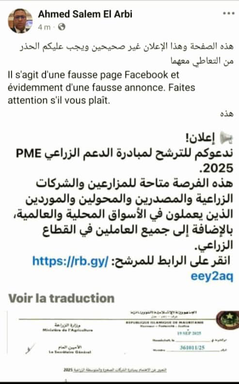حذر الأمين العام لوزارة الزراعة والسيادة الغذائية الدكتور احمد سالم ولد العربي من اعلان كاذب منشور على بعض الوسائط باسم وزارة الزراعة.