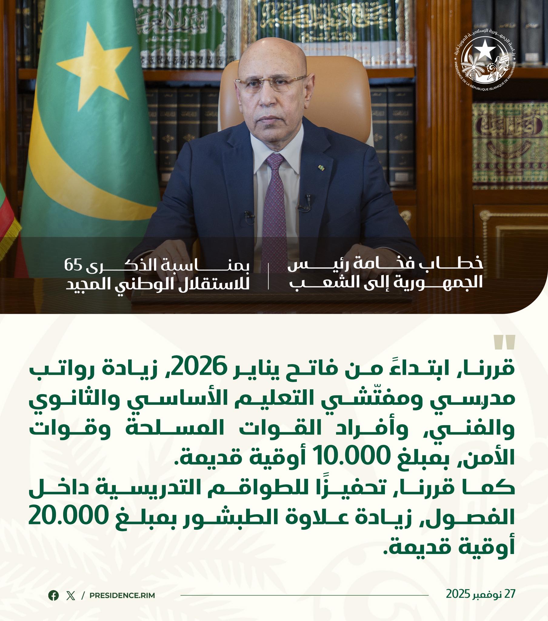أعلن الرئيس غزواني عن زيادة جديدة للرواتب لصالح المدرسين وأفراد القوات المسلحة وقوات الأمن ابتداءً من فاتح يناير 2026.