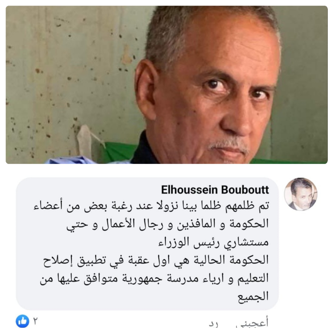 في سابقة من نوعها اتهم النائب في الأغلبية ومن حزب الإنصاف تحديدا الحسين ولد ببوط حكومة الوزير الأول المختار ولد اجاي بأنها أكبر عقبة أمام إصلاح التعليم وإرساء مدرسة جمهورية، ويتهم النائب تحديدا مستشارين للوزير الأول بالتواطؤ مع نافذين ورجال أعمال في هذا الفساد وهو هنا يتحدث عن منح بعض المدارس الخاصة حق تدريس السنوات الأوائل.