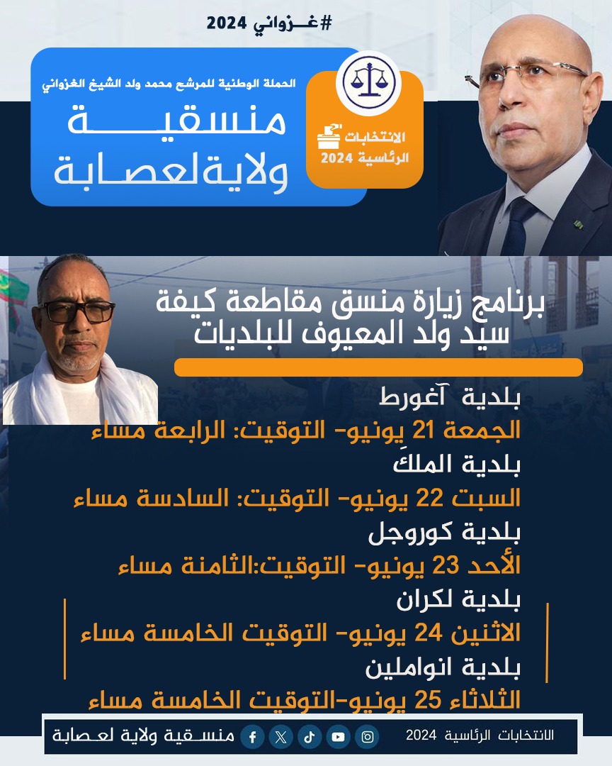 من المقرر أن يبدأ المنسق المقاطعى لحملة المرشح محمد ولد الشيخ الغزواني مساء اليوم الجمعة 21 يونيو جولة داخلية للإطلاع على سير الحملة الانتخابية وعمليات الدعاية والتعبئة للمرشح.