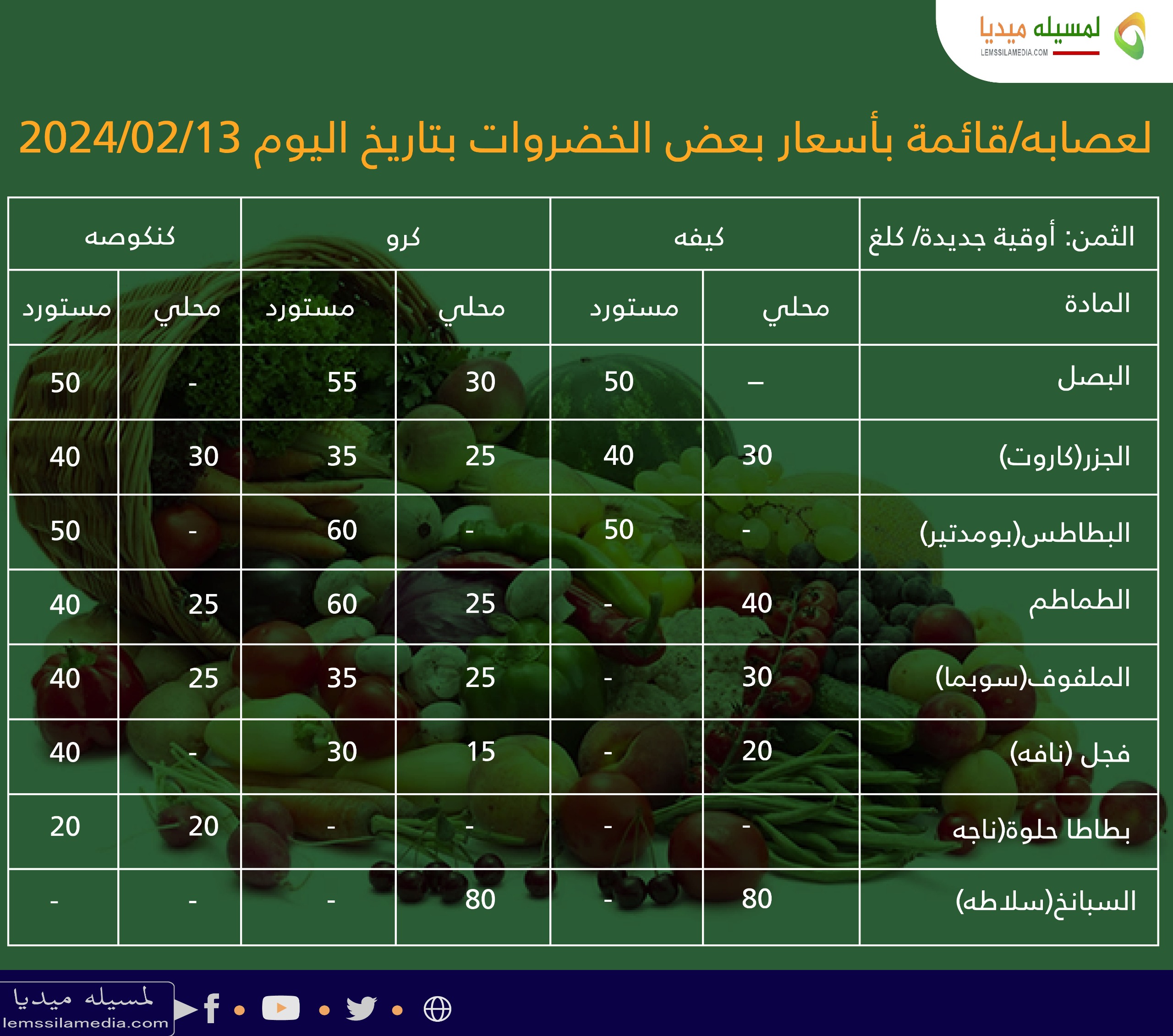 في إطار رصدها لتأثيرات قرار السلطات الموريتانية القاضي بحماية المنتوج المحلي من الخضروات عبر رفع التعريفة الجمركية على بعض اصناف الخضروات المستوردة، لمسيله ميديا رصدت لكم أسعار بعض هذه المواد في ثلاث مقاطعات من ولاية لعصابه بتاريخ اليوم 13 فبراير 2024.