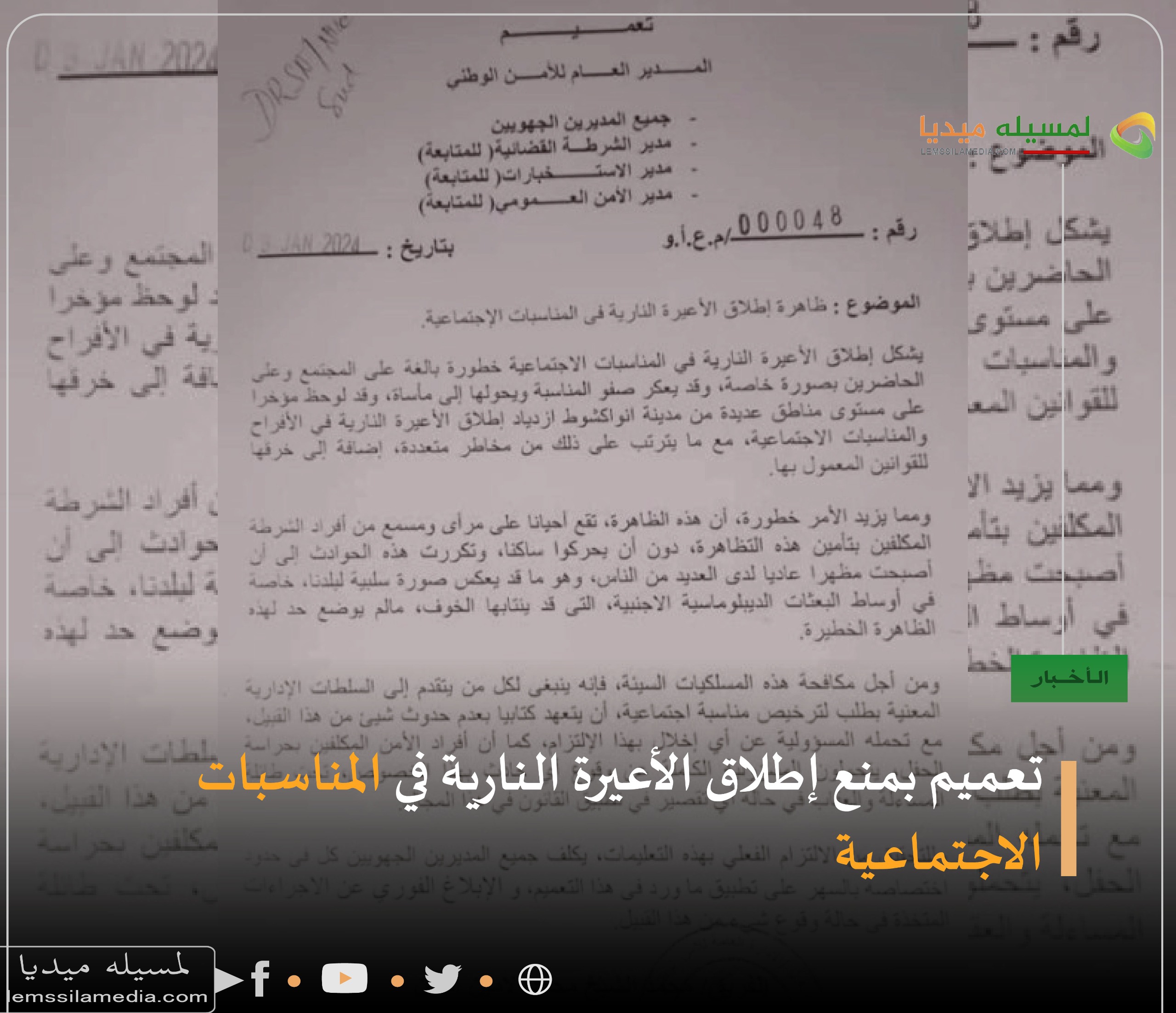 ودعا مدير الأمن إلى إلزام من يتقدم بطلب ترخيص مناسبة اجتماعية أن يتعهد كتابيا بعدم إطلاق الأعيرة النارية «مع تحمله المسؤولية عن أي إخلال بهذا الالتزام».