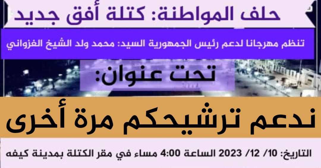 تدعو كتلة افق جديد المنضوية في حلف المواطنة برئاسة الوزير لمرابط ولد بناهي جماهير كيفه الى حضور مهرجان سياسي حاشد ستنظمه دعما لترشح فخامة رئيس الجمهورية محمد ولد الشيخ الغزواني لمامورية جديدة،و ذلك بتاريخ 10 ديسمبر 2023 بمقر الكتلة بمدينة كيفه.