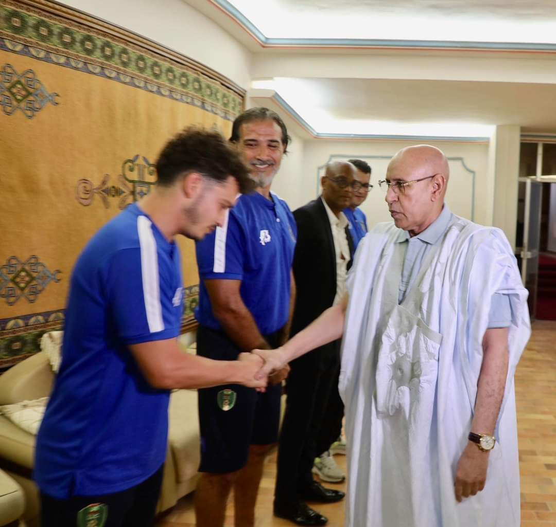 وجرى اللقاء بحضور وزير الثقافة والشباب والرياضة، والوزير مدير ديوان الرئيس ورئيس الاتحادية الموريتانية لكرة القدم والجهاز الفني للفريق.