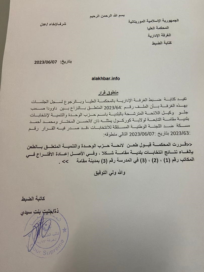 قررت الغرفة الإدارية بالمحكمة العليا قبول الطعن شكلا و مضمونا في نتائج اقتراع 13 مايو المنصرم في المكاتب المدرسة رقم 3 (المكاتب 1،2،3)، و إعادة الاقتراع فيها.