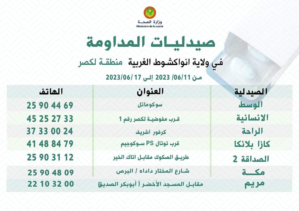 عنوانين و هواتف صيدليات المداومة في أنواكشوط خلال الفترة من 11 إلى 17 يونيو الجاري